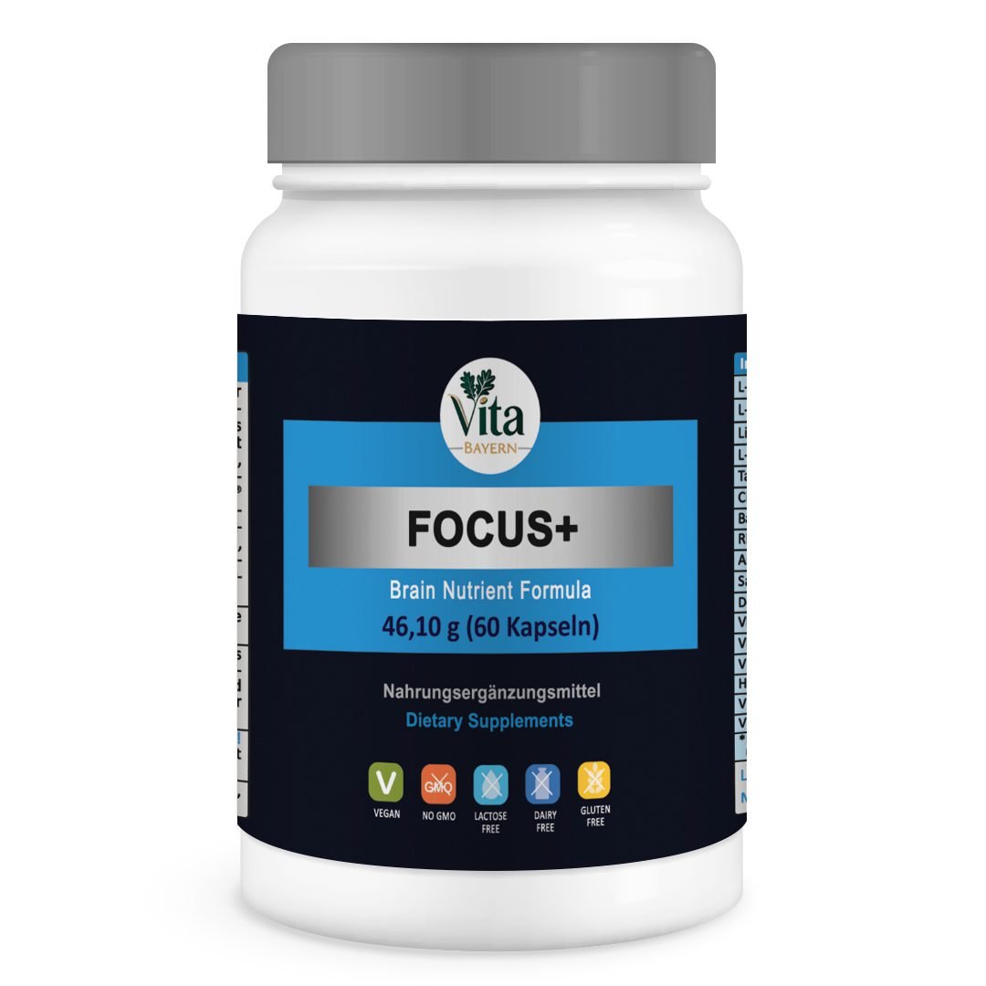 Focus+ is a food supplement formulated with a combination of amino acids, botanical ingredients, vitamins, and minerals. The formula contains ingredients such as L-theanine, L-carnitine, rhodiola rosea extract, ashwagandha (KSM-66®), and velvet bean extract, which are commonly used in food supplements, together with essential vitamins and minerals. The included vitamins contribute to the normal function of the nervous system, normal psychological function, and normal energy-yielding metabolism, and to the reduction of tiredness and fatigue, supporting daily nutritional needs as part of a balanced diet.
